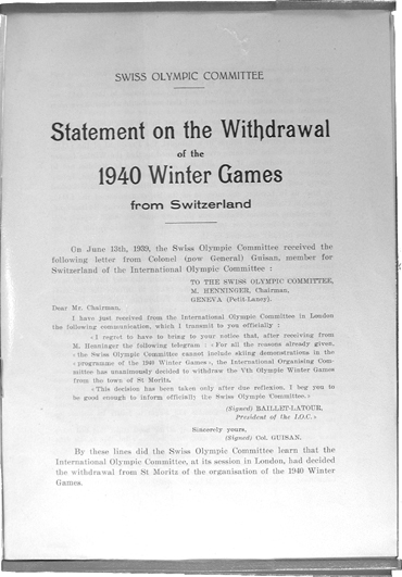 in English. Account of St. Moritz losing the 1940 Olympic Winter
